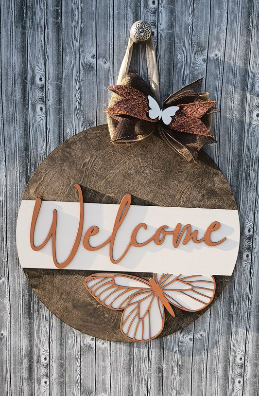 Welcome Butterfly Wooden Door Hanger – 18'' Hand-Painted Door Sign with Bow